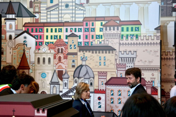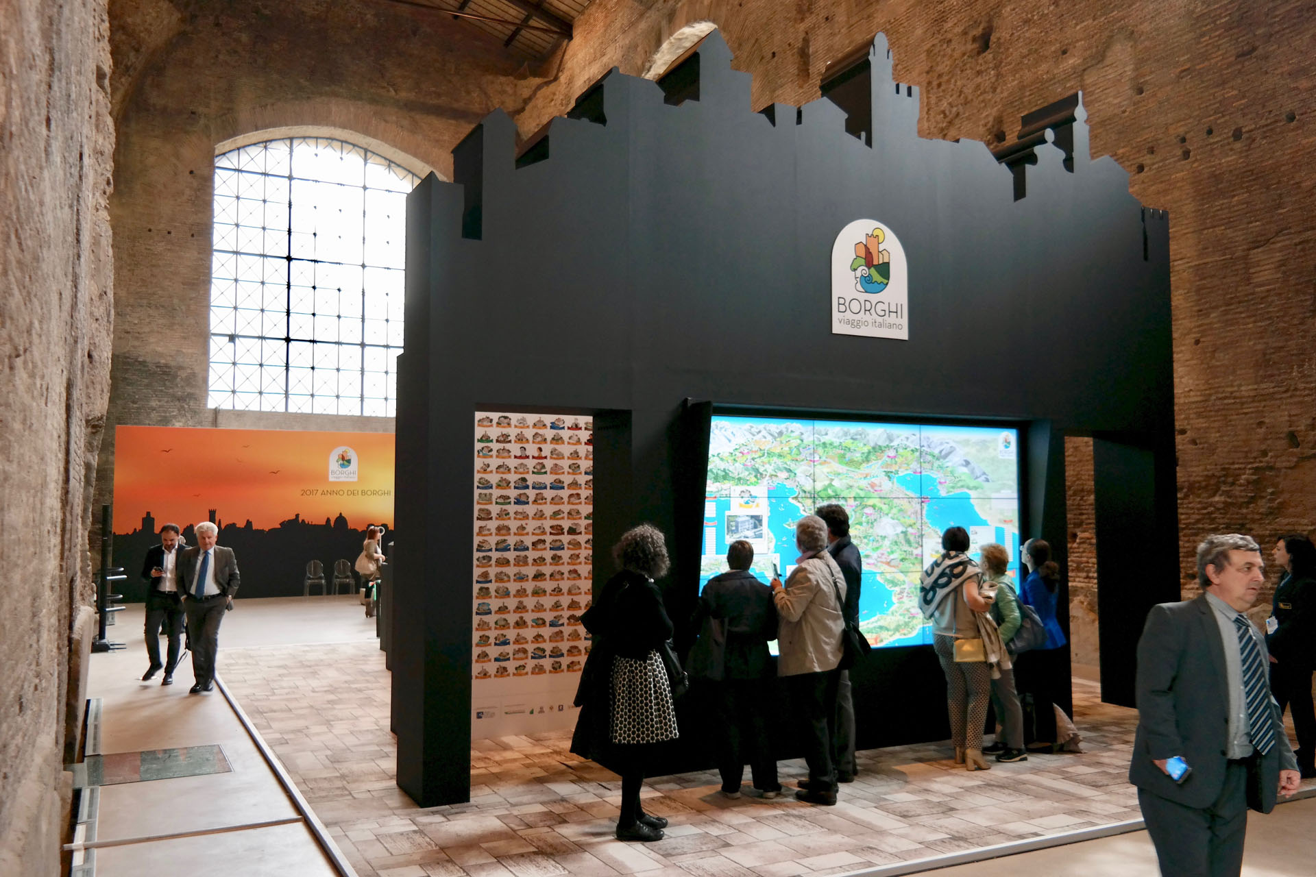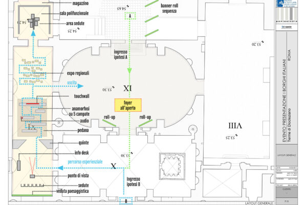 Questa prima attività introduce l’utente verso un vero e proprio percorso esperienziale all’interno dello scenario in precedenza osservato. Verranno svelati i segreti percettivi attraverso un tragitto non lineare, tipico dei Borghi italiani, che raccoglie nello sfondo della sala l’area expò dedicata alla presentazione delle Regioni. La Piazzetta delle Regioni si configura attraverso una serie di banchi/espositori che evocano l’immagine di un tipico mercato rionale. Ogni Regione potrà allestire lo spazio in funzione delle proprie caratteristiche ed il percorso dell’utente si introduce all’interno dei valori locali. L’esplorazione fisica viene sostenuta anche dal modello interattivo, attraverso la presenza di un touchwall che, collocato alle spalle dell’ultimo pannello dell’anamorfosi, favorisce gli incrementi culturali. La mappa illustrata dei borghi italiani sarà focalizzata attraverso il grande schermo che consentirà l’interazione diretta su temi e contenuti specifici anche per favorire nozioni didattiche.