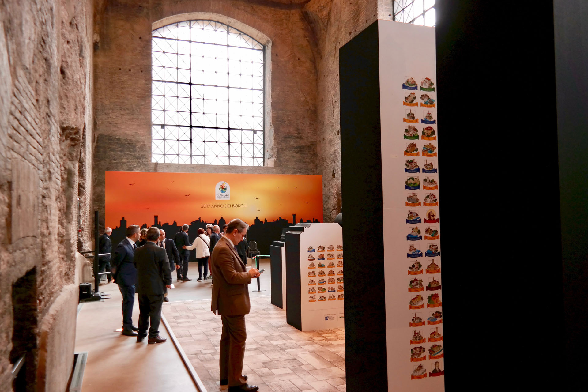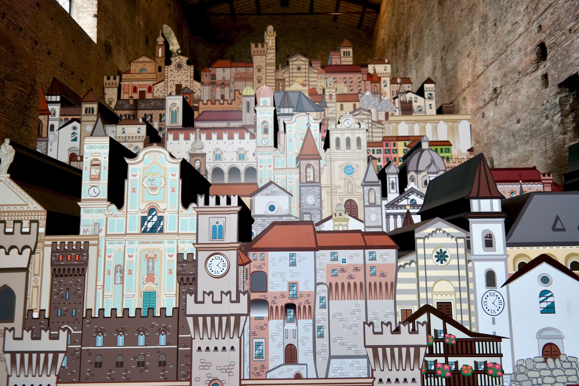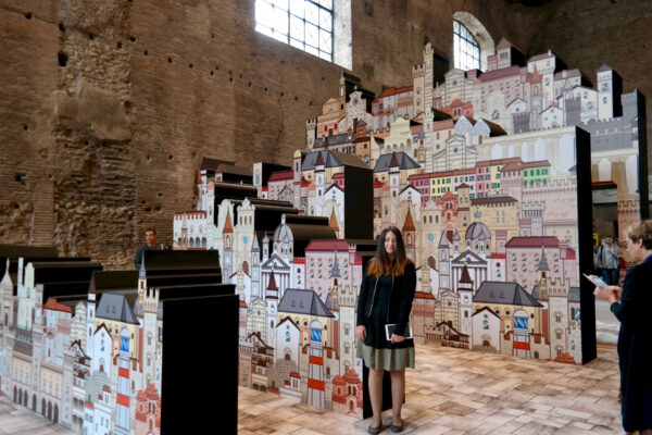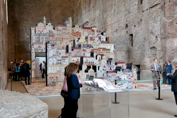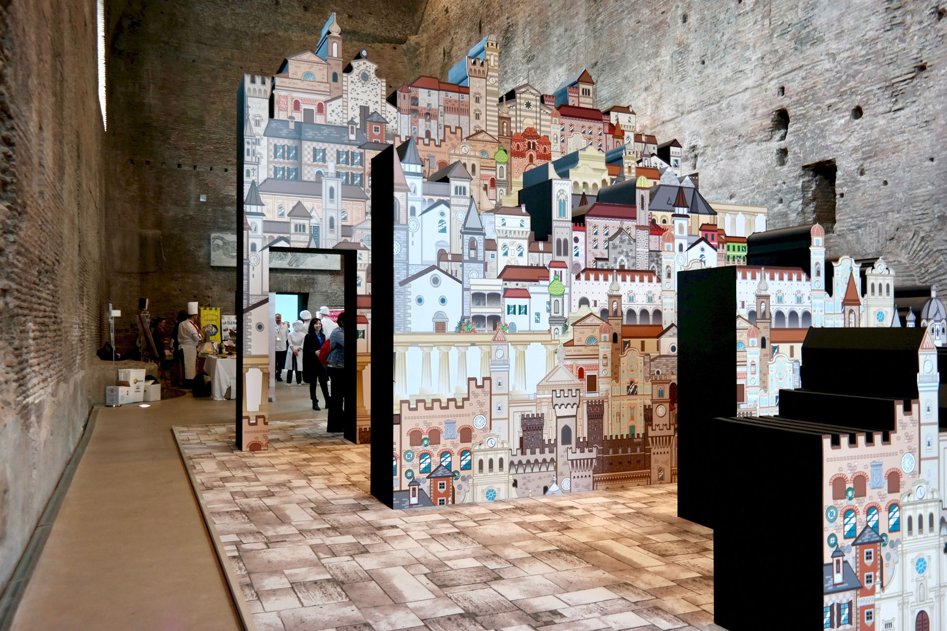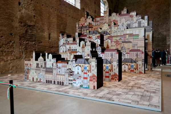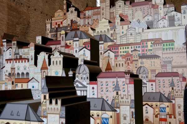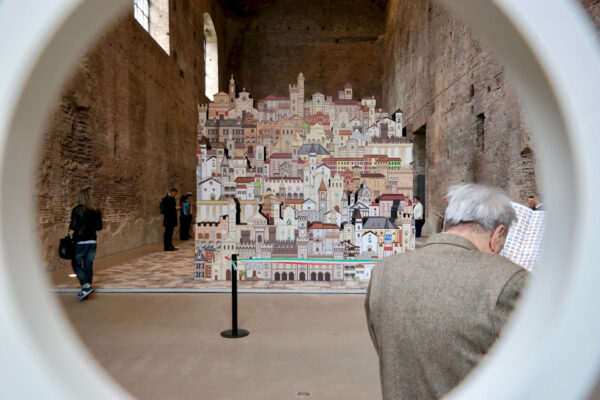 In prossimità dell’ingresso alla sala sarà individuato un punto specifico d’osservazione che consentirà allo spettatore di vedere una scena che definisce l’archetipo immaginario dedicato al tema dei Borghi. Attraverso una strategica anamorfosi lo spettatore potrà percepire un complesso di segnali visivi che rimandano ad un borgo ideale, sostenuto anche da suoni e musiche tradizionali.