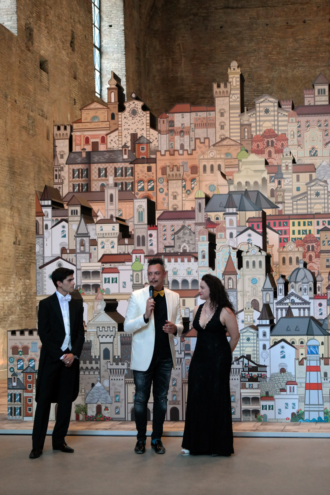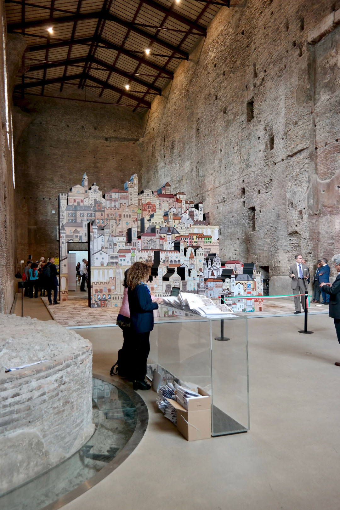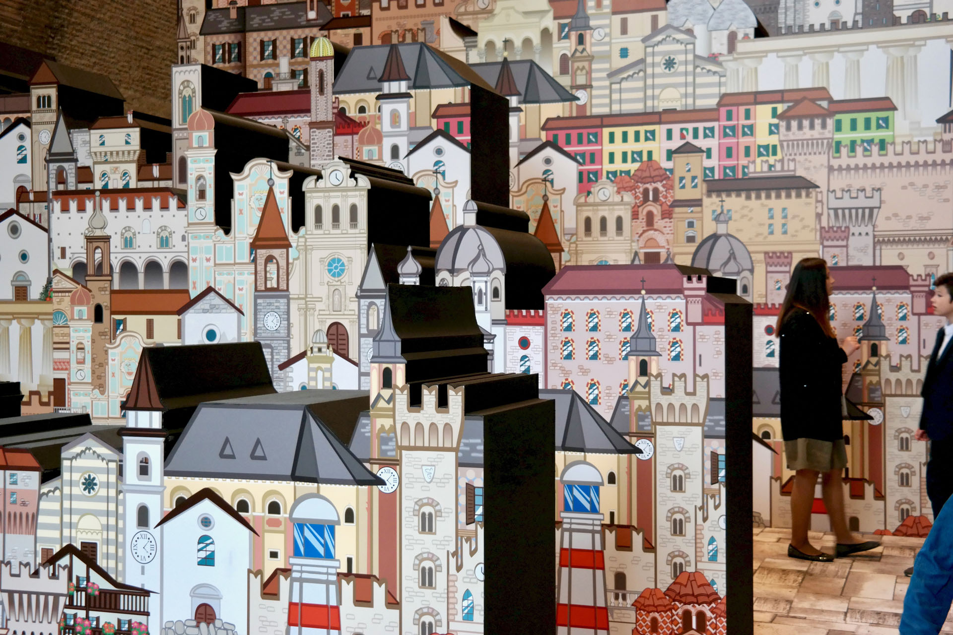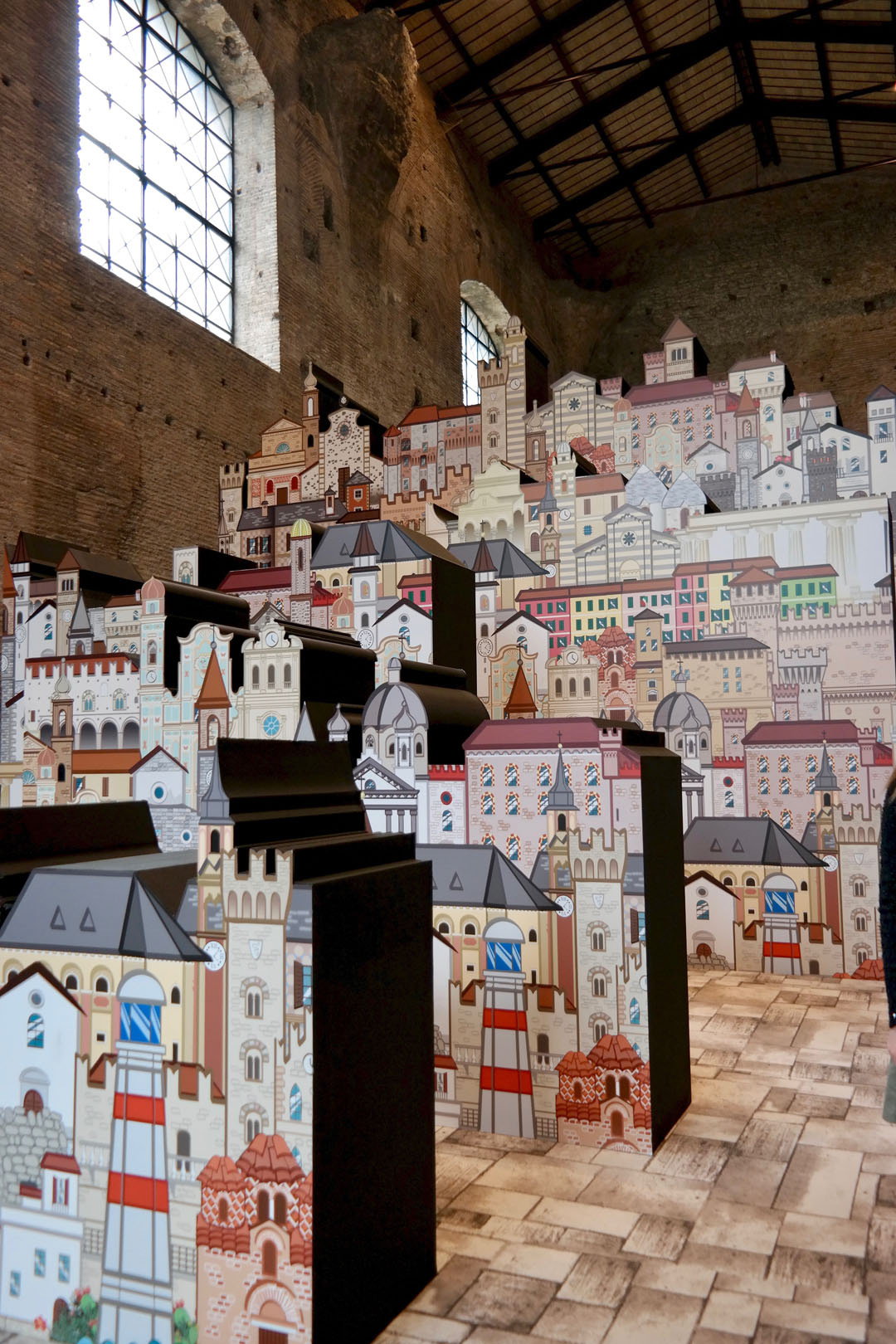In prossimità dell’ingresso alla sala sarà individuato un punto specifico d’osservazione che consentirà allo spettatore di vedere una scena che definisce l’archetipo immaginario dedicato al tema dei Borghi. Attraverso una strategica anamorfosi lo spettatore potrà percepire un complesso di segnali visivi che rimandano ad un borgo ideale, sostenuto anche da suoni e musiche tradizionali.